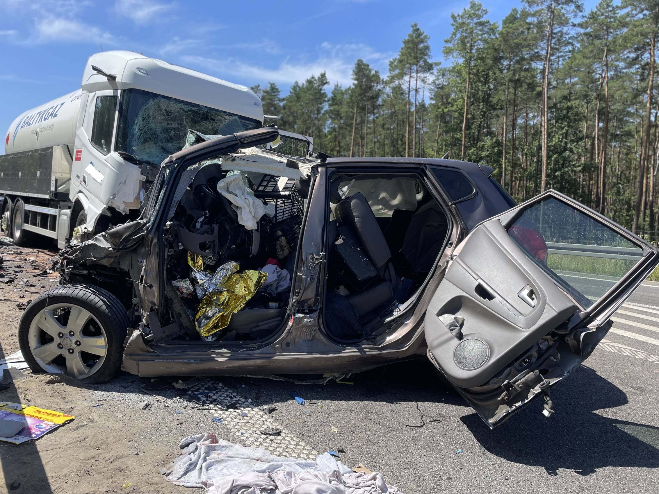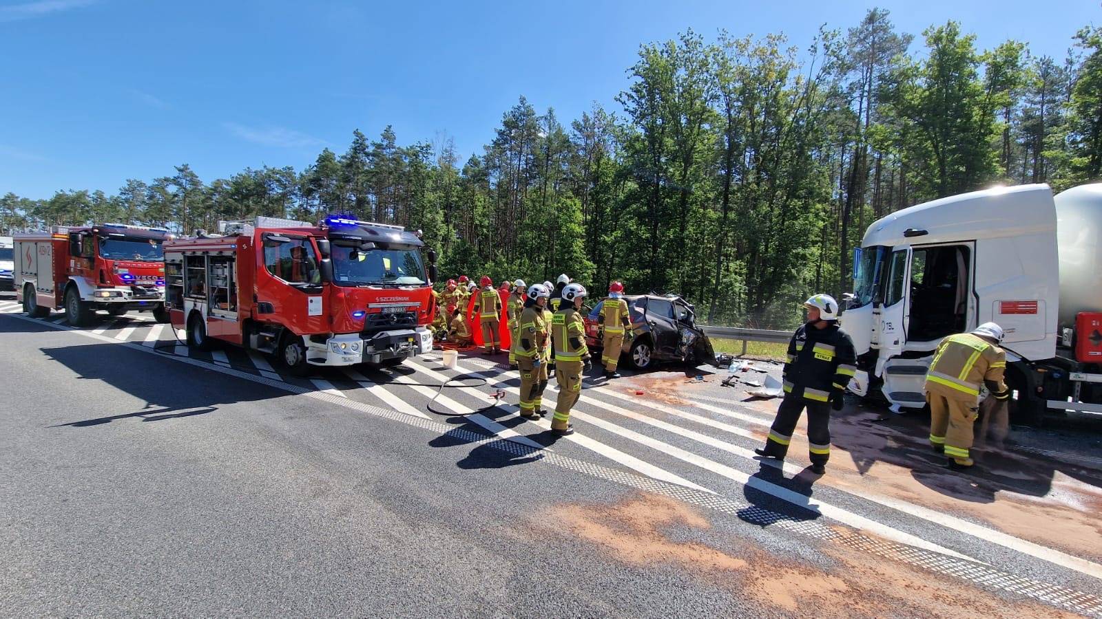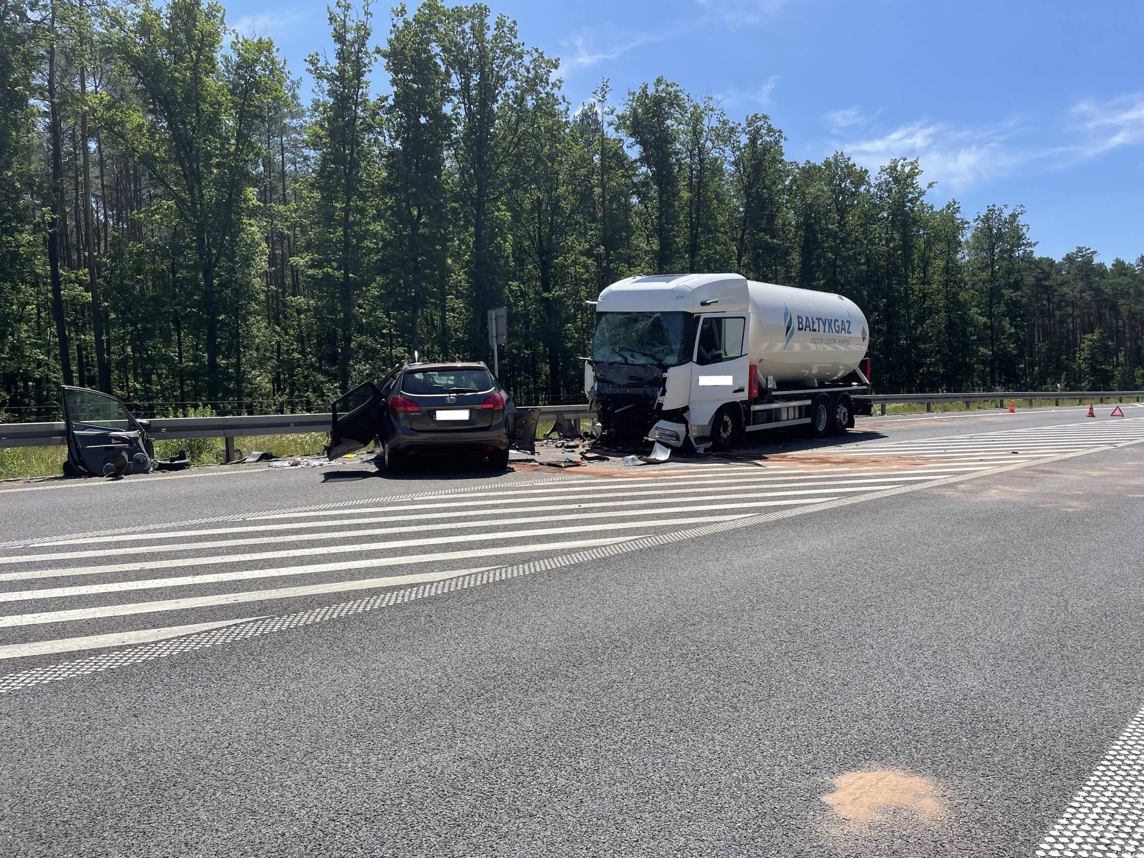 Do zdarzenia doszło w poniedziałek, 30 czerwca tuż przed godziną 10.00 rano. Wstępnie wszystko wskazuje na to, że kierujący samochodem osobowym Kia, zjechał na przeciwległy pas ruchu, wówczas doszło do czołowego zderzenia z ciągnikiem siodłowym przewożącym ładunek gazu.